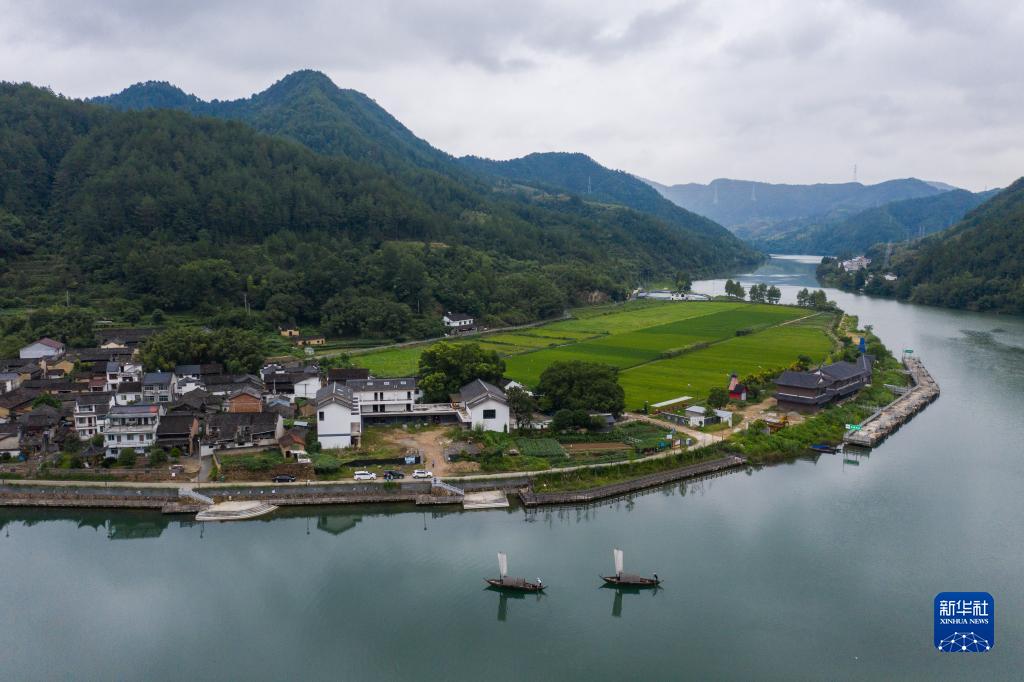 8月30日拍攝的緊鄰甌江的緊水灘鎮石浦村,這也是當地“十里云河”鄉村旅游的特色景觀村落(無人機照片)。石浦村位于云和縣縣城北部,該村地理位置優越,自然風光秀麗,是省級重點歷史文化古村落保護村。
