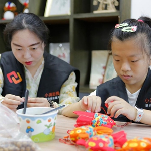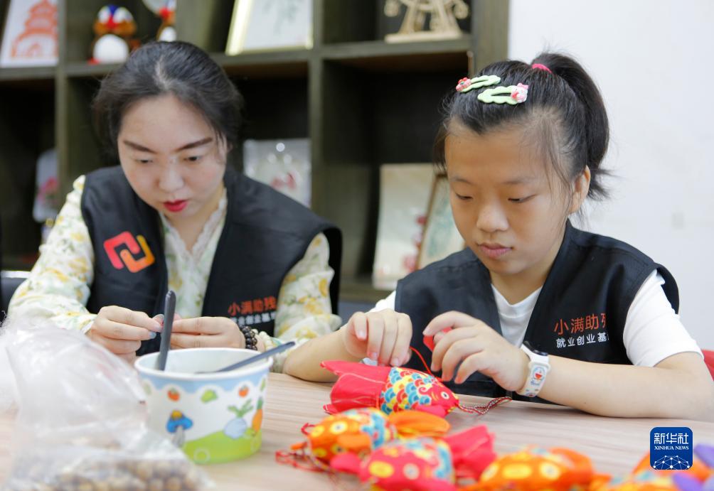 8月30日,在江蘇揚州小滿助殘就業創業基地,殘疾人士學習制作手工藝品。