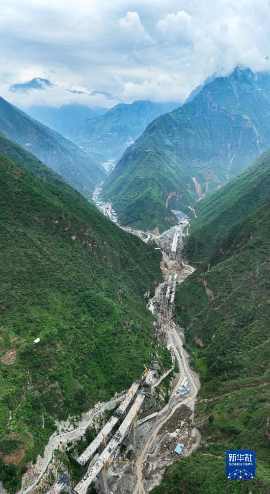 8月30日拍攝的位于金陽縣境內蘆稿林河下游的蜀道集團沿江高速JN1(金寧一)標段項目部鋼筋加工場民工駐地板房(右下)已被山洪沖毀(無人機照片)。