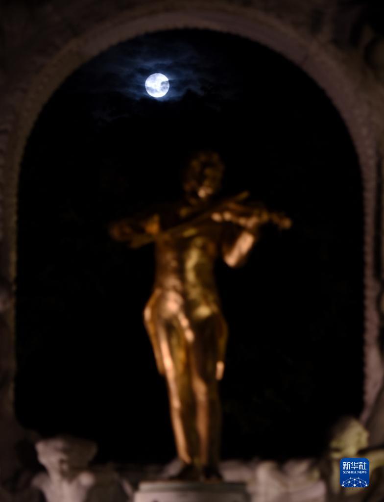 這是8月30日在奧地利維也納城市公園內的施特勞斯雕像前拍攝的“超級月亮”。