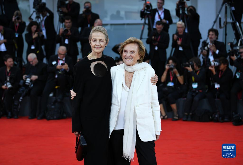 8月30日,在意大利威尼斯,獲得終身成就金獅獎的意大利導演利利亞娜·卡瓦尼(右)和演員夏洛特·蘭普林亮相開幕式紅毯。