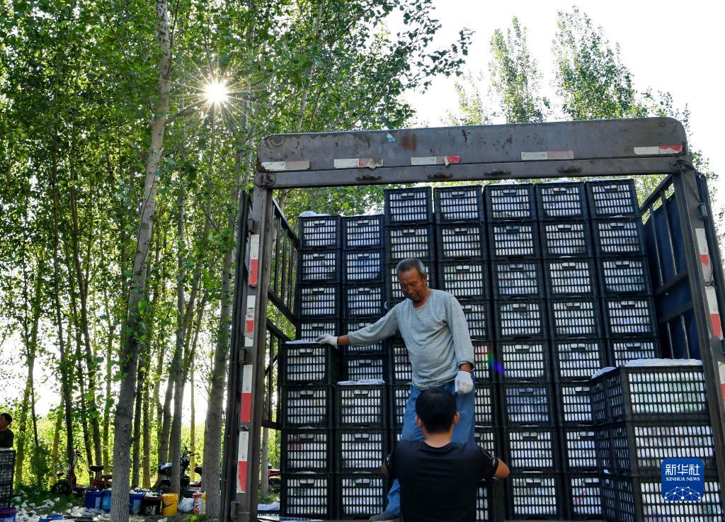 8月29日,河北唐山遷安市新房子村農民將鮮梨裝車外運。