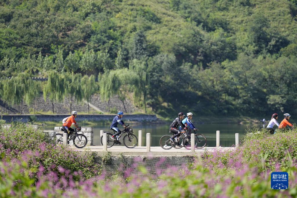 8月30日,騎行愛好者在河北唐山遷安市萬寶溝村內騎行。該村依托長城旅游資源打造成自行車運動主題村。