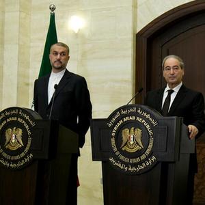 8月30日,在敘利亞大馬士革,敘利亞外長梅克達德(右)和伊朗外長阿卜杜拉希揚出席聯合記者會。
