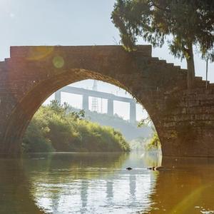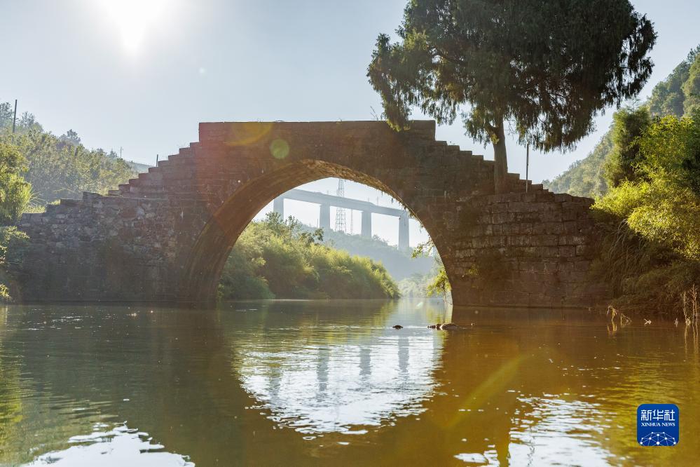 8月31日,一列動車組在晨曦中經過貴南高鐵銀坡河特大橋,前為建于清代光緒年間的蒙家橋。