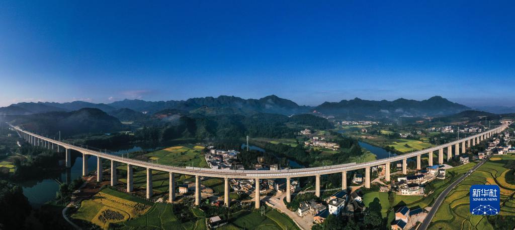 這是8月31日拍攝的位于貴州省都勻市境內的貴南高鐵營盤清水河雙線特大橋(無人機全景照片)。