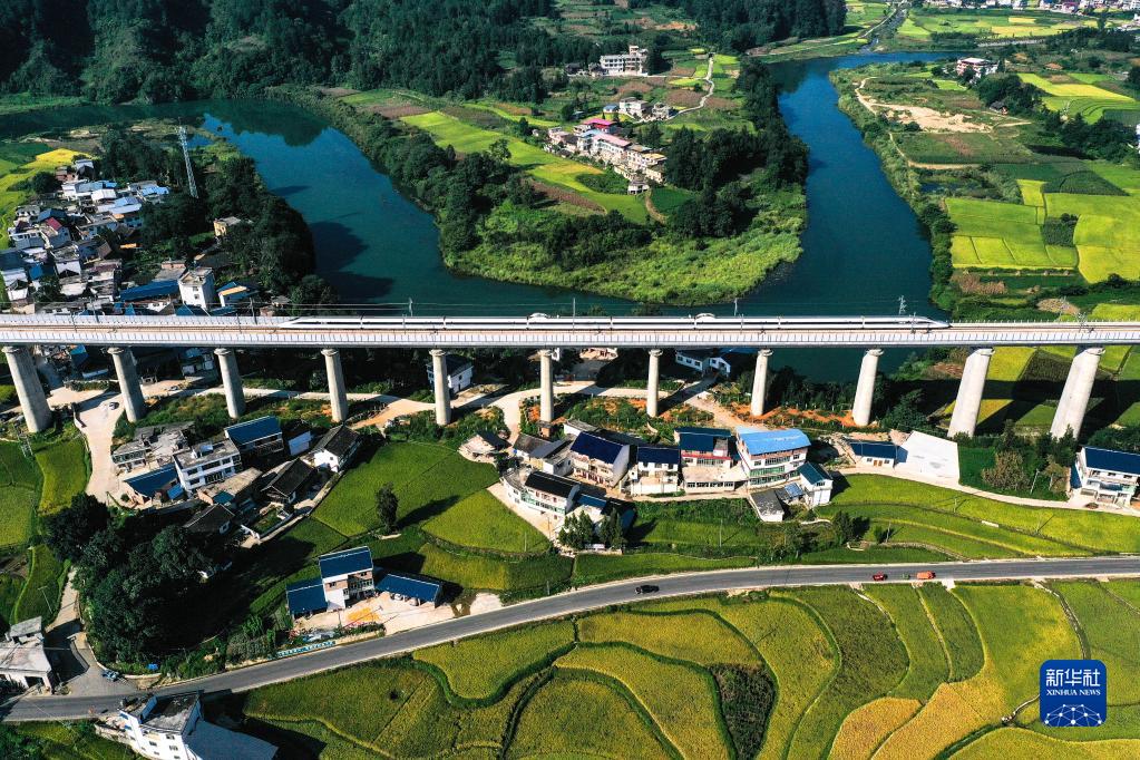 8月31日,一列動車組列車經過位于貴州省都勻市境內的貴南高鐵營盤清水河雙線特大橋(無人機照片)。