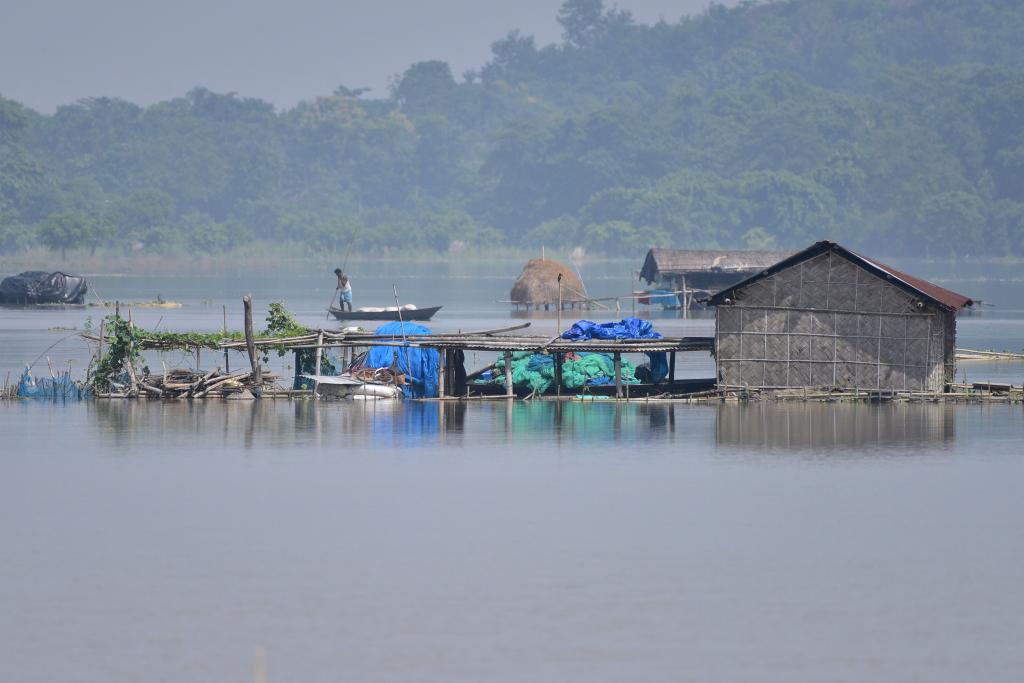 8月30日,在印度東北部阿薩姆邦,一名男子劃船經過浸泡在洪水中的房屋。