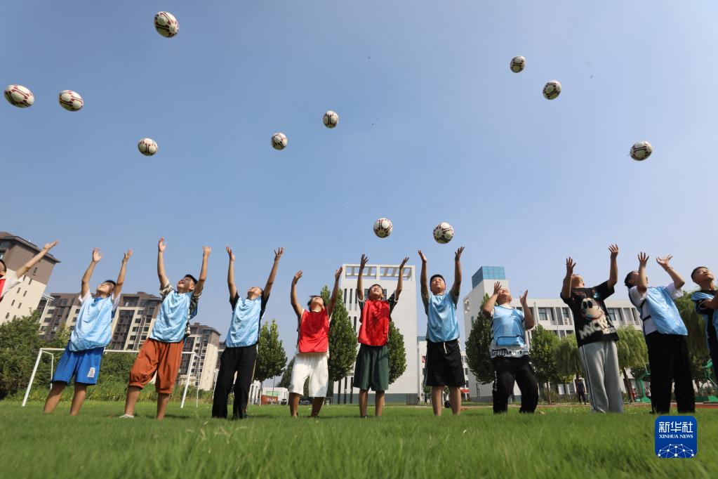 8月31日,河南省焦作市溫縣第四實驗小學學生在體育課上學習足球技能。