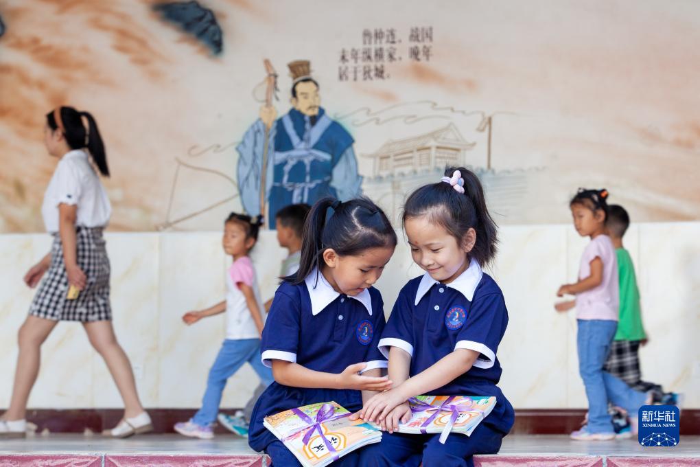 8月31日,山東省淄博市高青縣中心路小學,兩位一年級新生領到新書和新校服后在一起交流。