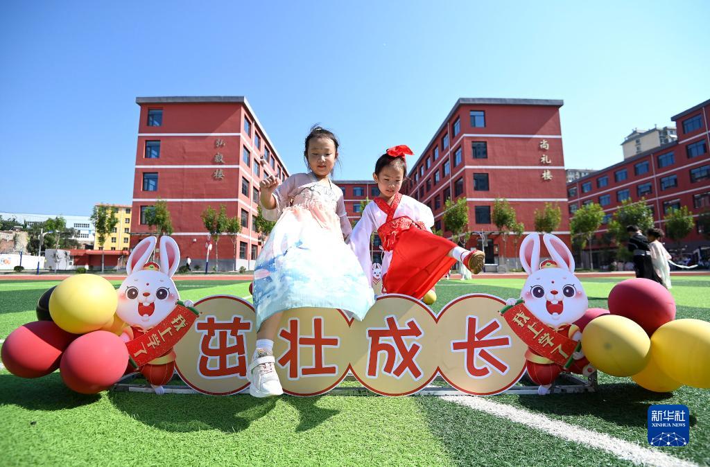 8月31日,河北省邯鄲市峰峰礦區滏北小學的一年級新生在進行“跨欄禮”。
