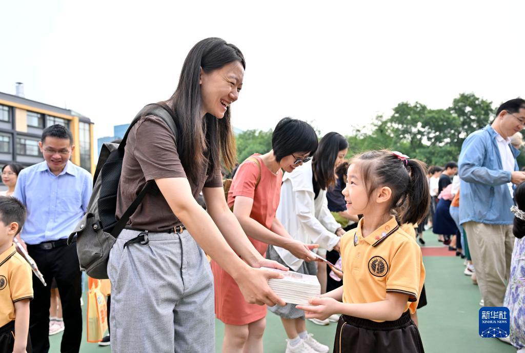 8月31日,北京第二實驗小學為一年級新生舉辦開筆禮。這是家長在開筆禮上向孩子贈送書籍。