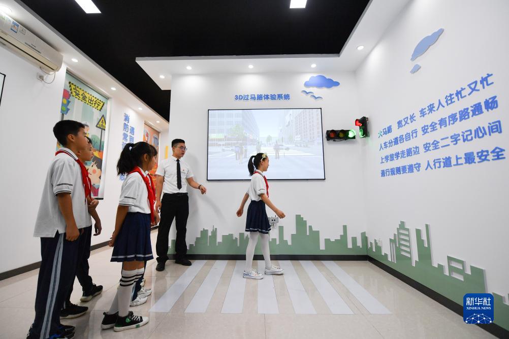 8月31日,在西安市鄠邑區新區小學,老師對學生進行道路安全教育。