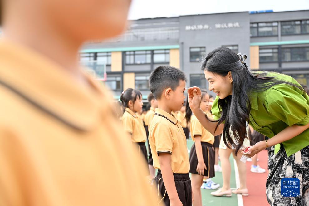 8月31日,北京第二實驗小學為一年級新生舉辦開筆禮。這是老師在開筆禮上為學生點朱砂啟智。