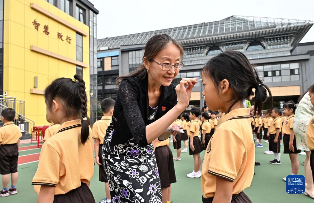 8月31日,北京第二實驗小學為一年級新生舉辦開筆禮。這是老師在開筆禮上為學生點朱砂啟智。