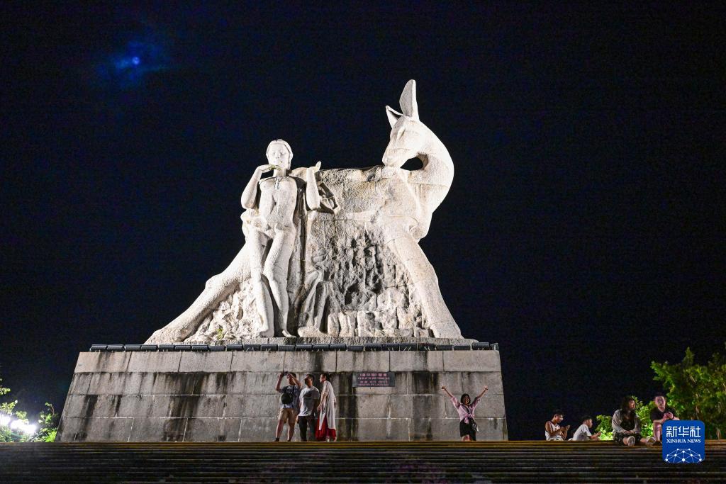 8月29日,游客在鹿回頭風景區標志性景點鹿回頭雕像前游玩。