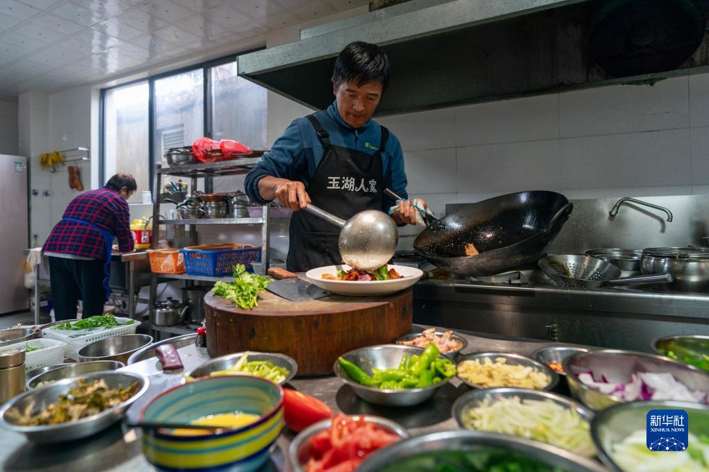 麗江市玉龍納西族自治縣白沙鎮玉湖村村民和武全在自家開的農家樂廚房里炒菜(8月28日攝)。
