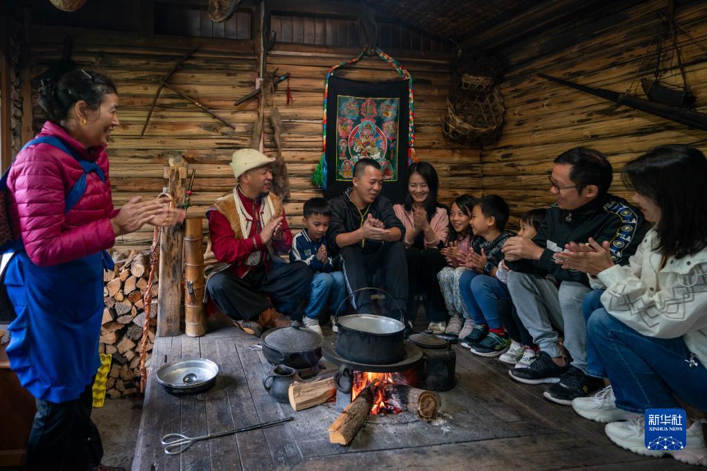 麗江市玉龍納西族自治縣白沙鎮玉湖村村民和杰林(左二)和妻子(左一)在火塘邊帶著游客唱納西族歌曲(8月28日攝)。