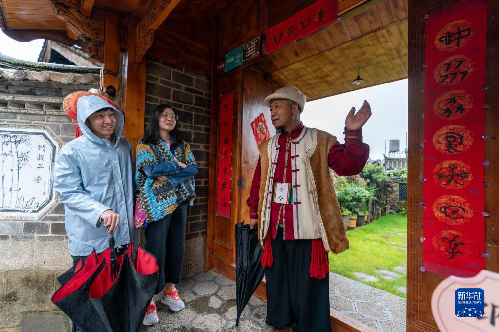 麗江市玉龍納西族自治縣白沙鎮玉湖村村民和杰林(右)為來自北京的游客李嘉琪(中)和她的丈夫介紹納西族東巴文(8月28日攝)。