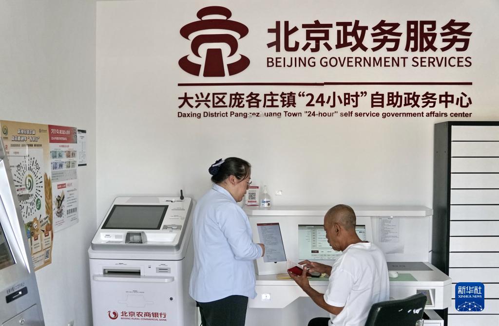 8月31日,大興區龐各莊鎮政務服務中心的工作人員幫助一位老人辦理金融業務。