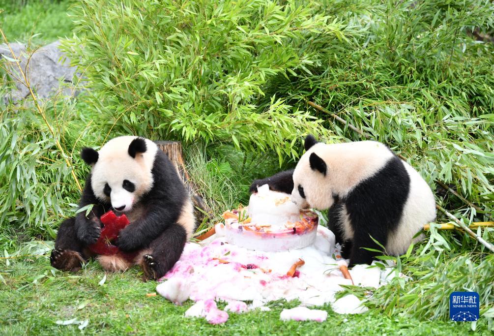 當日,在德國出生的大熊貓雙胞胎兄弟“夢想”和“夢圓”迎來4歲生日,柏林動物園為它們舉辦了慶?;顒?。