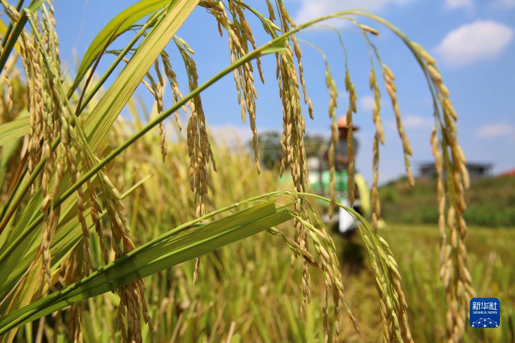 8月30日,在湖南省邵陽市隆回縣花門街道芙蓉山村,村民駕駛農機收割中稻。
