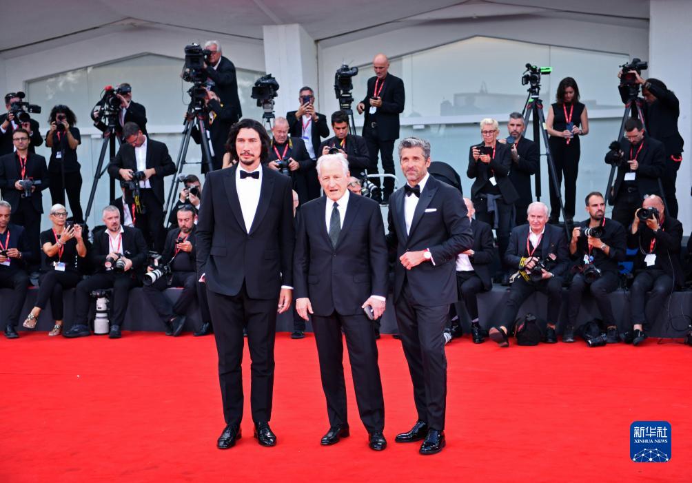8月31日,在意大利威尼斯,電影《法拉利》導演邁克爾·曼(中)和演員亞當·德里弗(左)、帕特里克·登普西亮相首映式紅毯。