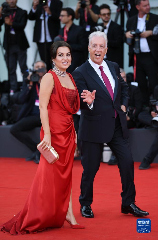 8月31日,在意大利威尼斯,法拉利汽車創始人恩佐·法拉利之子皮耶羅·法拉利(右)亮相電影《法拉利》首映式紅毯。