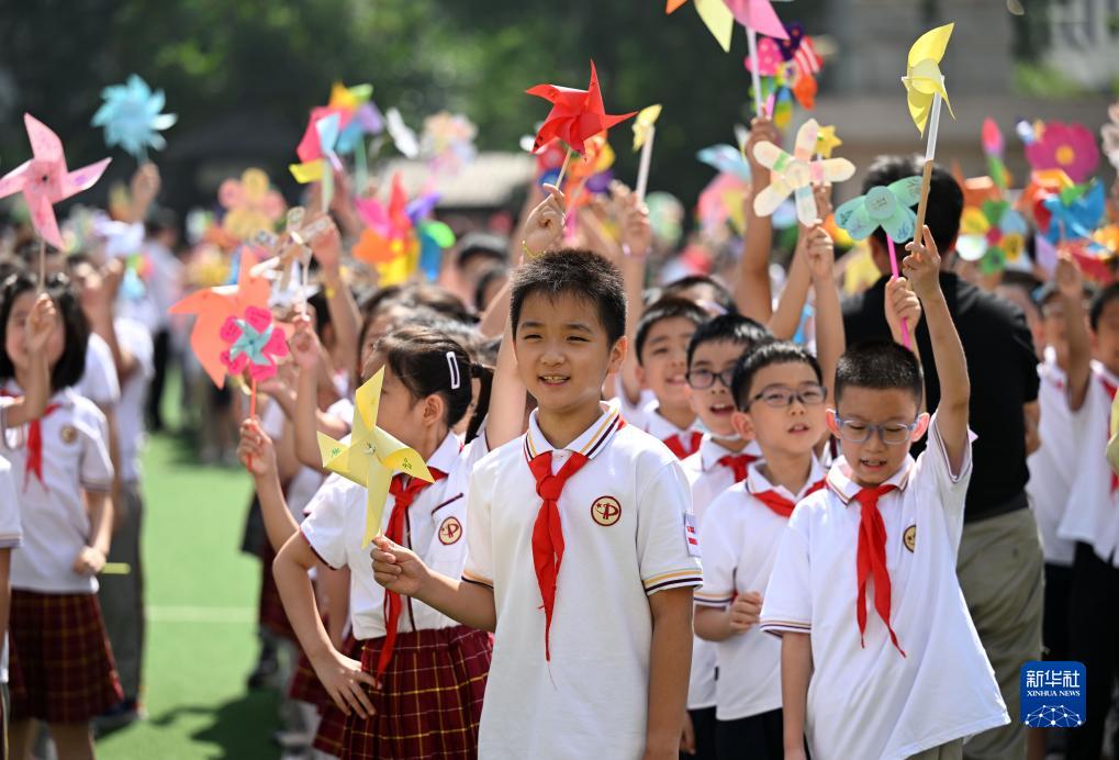 9月1日,在天津市和平區中心小學,學生們在開學典禮上旋轉自己制作的風車。