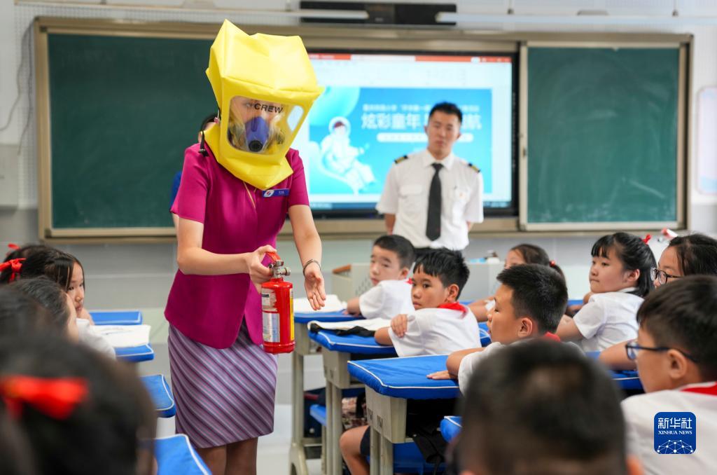 9月1日,在全國航空特色學校重慶市九龍坡區鐵路小學開學第一課的課堂上,來自重慶航空的空乘人員在為六年級學生演示如何正確使用客機上的應急處置裝備。
