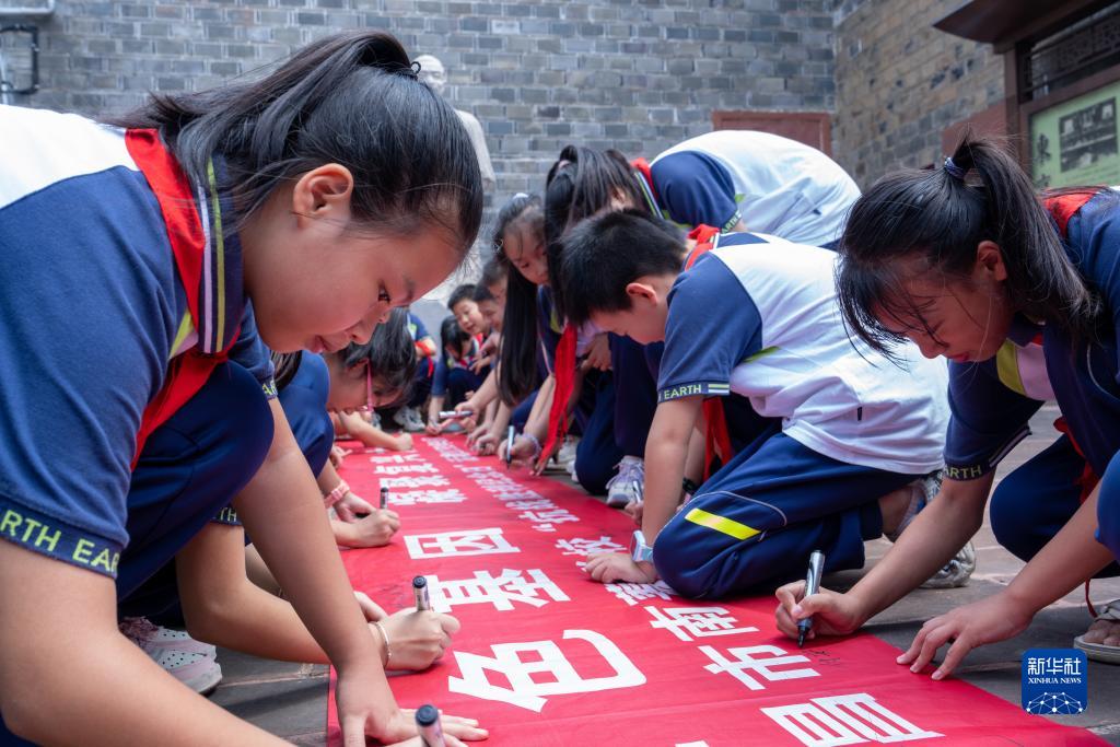9月1日,在“東京審判”中國大法官梅汝璈故居,參加“開學第一課”的南昌市青云譜區南菁學校學生在“賡續紅色基因、凝聚復興力量”橫幅上簽名。