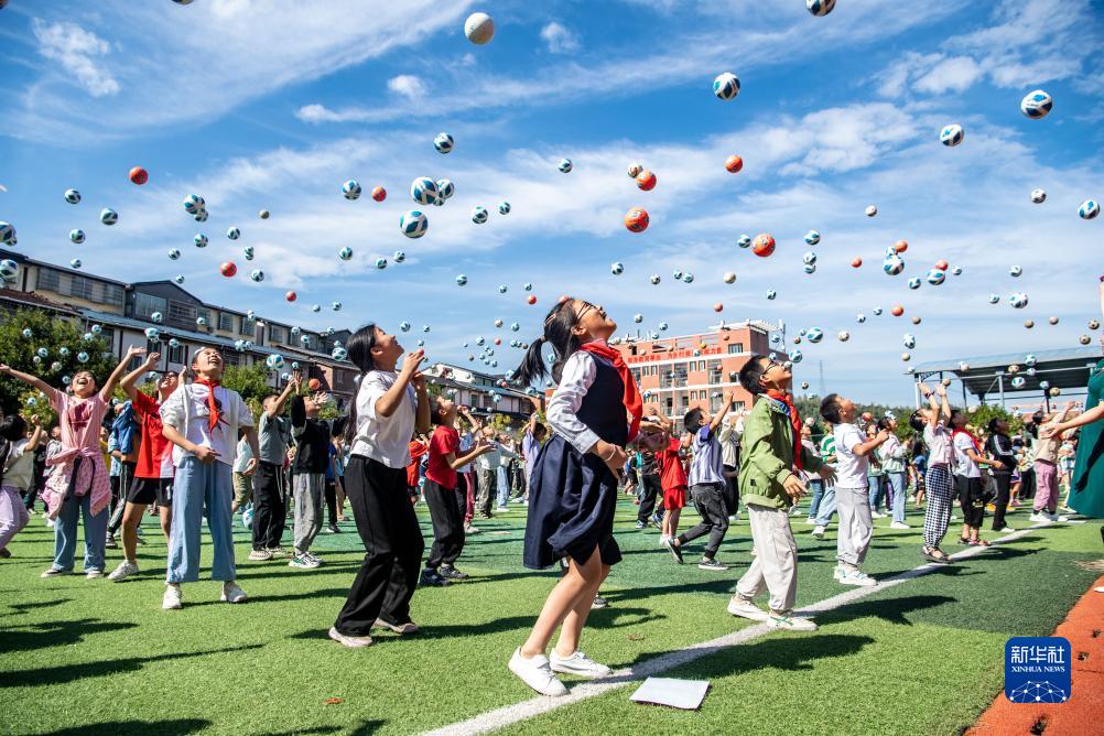 9月1日,在重慶市石柱土家族自治縣三河鎮三河小學,學生們在操場上拋出足球迎接開學。