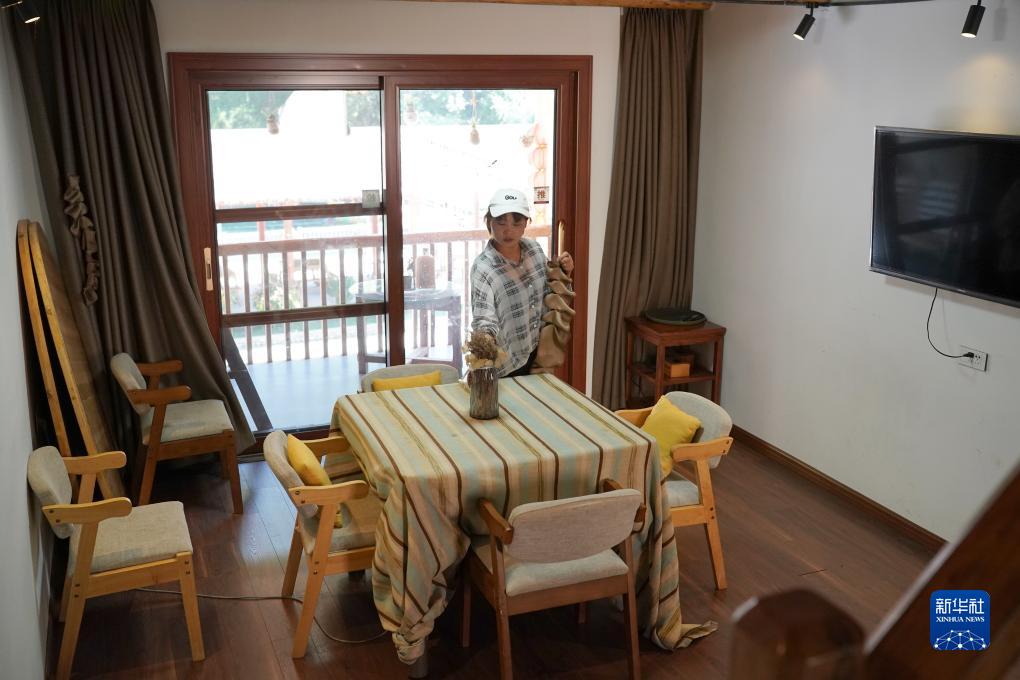 8月31日,旬陽市構元鎮羊山民俗村的工作人員在收拾整理客房。