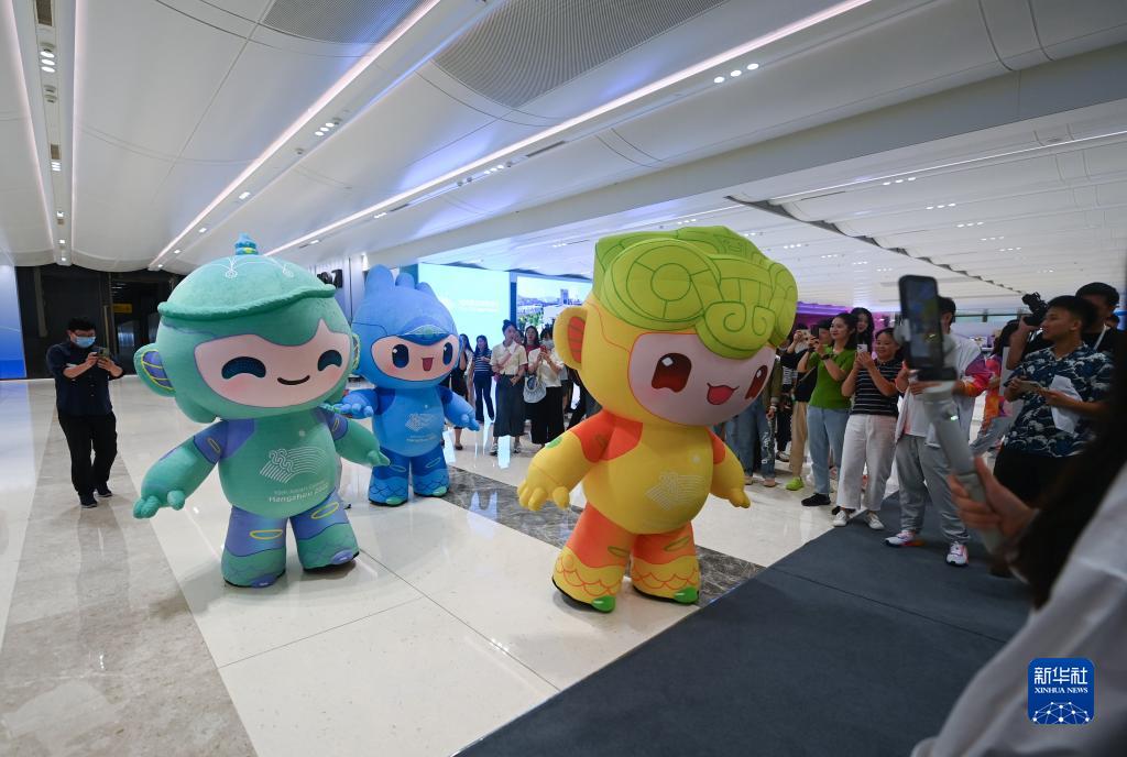 亞運會吉祥物“琮琮”“蓮蓮”“宸宸”在主媒體中心與記者互動(9月1日攝)。