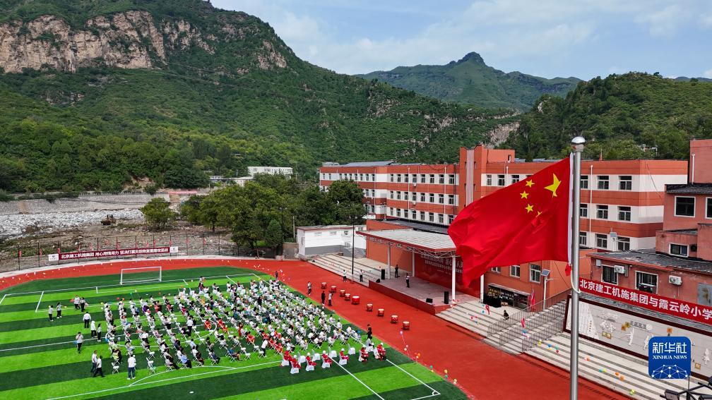 9月1日,在北京市房山區霞云嶺鄉霞云嶺中心小學,老師和學生在修繕一新的操場上參加開學典禮(無人機照片)。