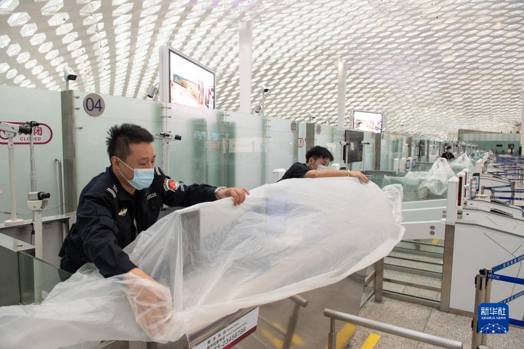 9月1日,在深圳寶安國際機場出發廳,工作人員包裹安檢儀器。
