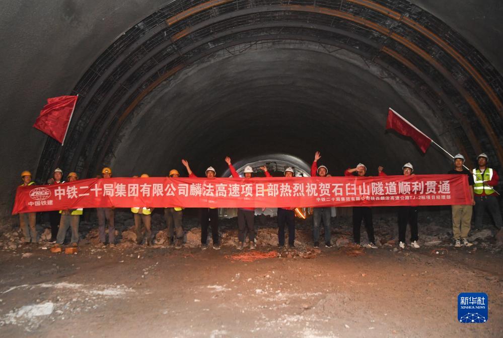 9月1日,施工人員在位于陜西省寶雞市麟游縣的麟法高速石臼山隧道慶祝隧道順利貫通。
