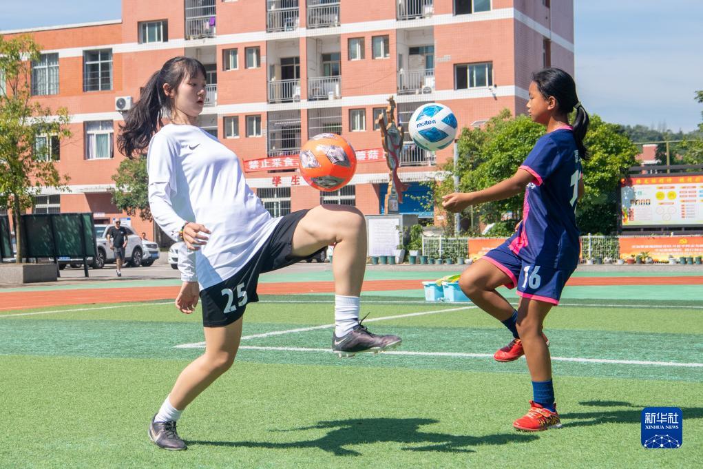 9月1日,在重慶市石柱縣三河鎮的三河小學,秦芙蓉(左)和足球隊隊員在操場上練球。