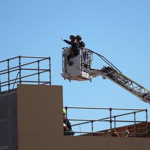 9月1日,在日本神奈川縣相模原市,消防員演練用消防云梯車救下被困高樓的民眾。