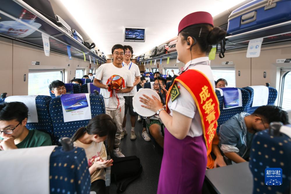 9月1日,在成都東站開往上海虹橋站的G3286次列車上,同濟大學新生在車廂內玩“擊鼓傳花”的游戲。