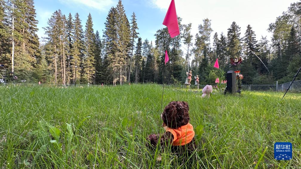 這是8月31日在加拿大薩斯喀徹溫省博瓦爾印第安人寄宿學校舊址拍攝的用粉色旗子標出的疑似兒童和嬰兒墓地。
