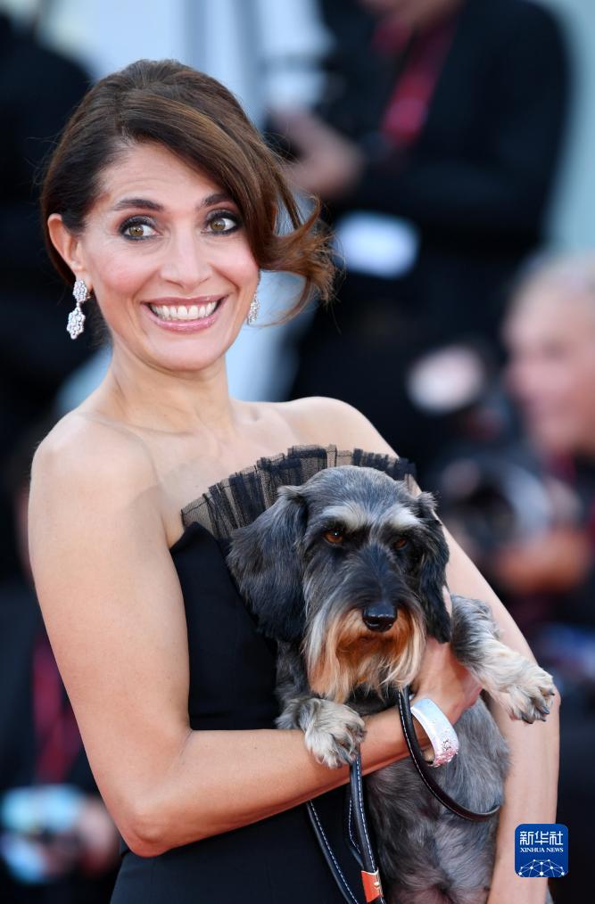 9月1日,在意大利威尼斯,演員卡泰麗娜·穆里諾抱著寵物狗亮相電影《可憐的東西》首映式紅毯。