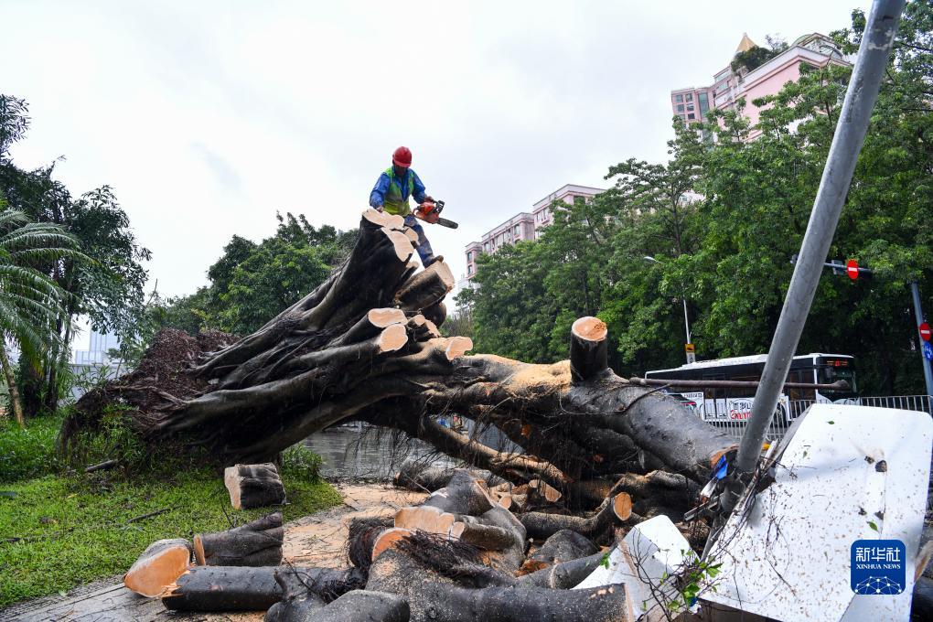 9月2日,在深圳主干道深南大道邊,綠化工人冒雨清理倒伏的大樹。