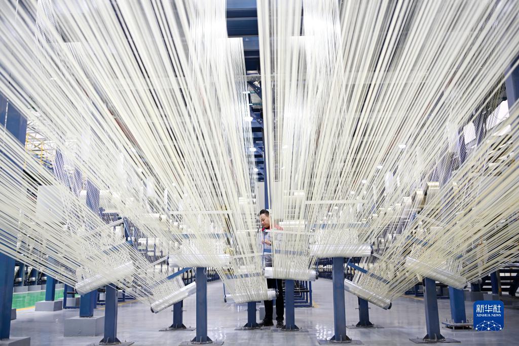 在中國建材集團西寧萬噸碳纖維生產基地,工作人員在整理碳纖維原絲(8月27日攝)。
