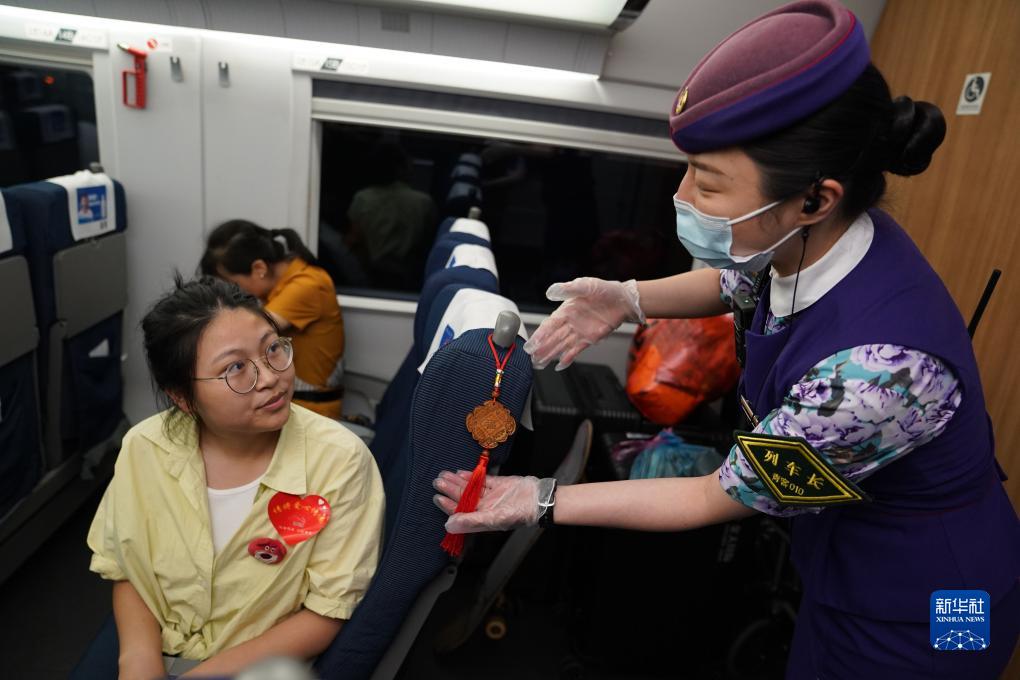 在列車上,列車長專門在蔣張子怡的座椅上掛上代表重點旅客的標識(8月31日攝)。