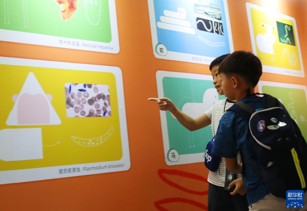9月2日,小朋友在一個寄生蟲知識展板前參觀。