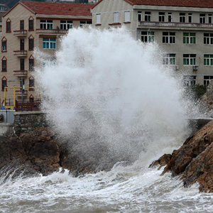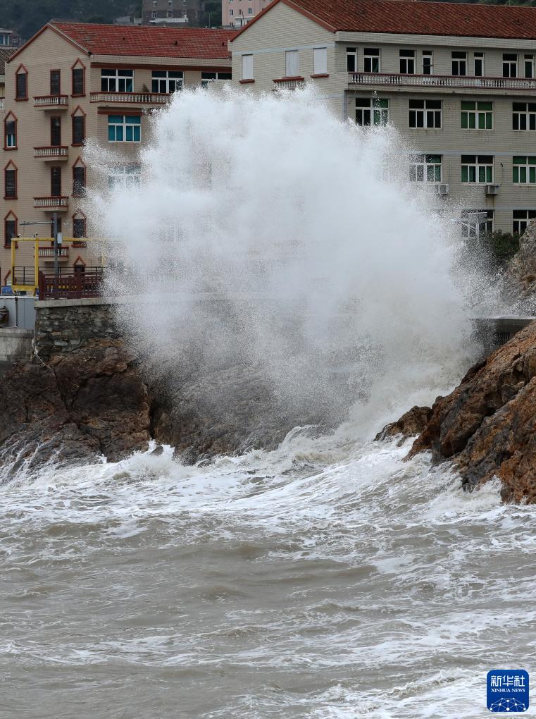 受今年第11號臺風“??庇绊?,在浙江省溫嶺市石塘鎮金沙灘附近,海浪一波接著一波拍向岸邊,激起巨大的浪花。