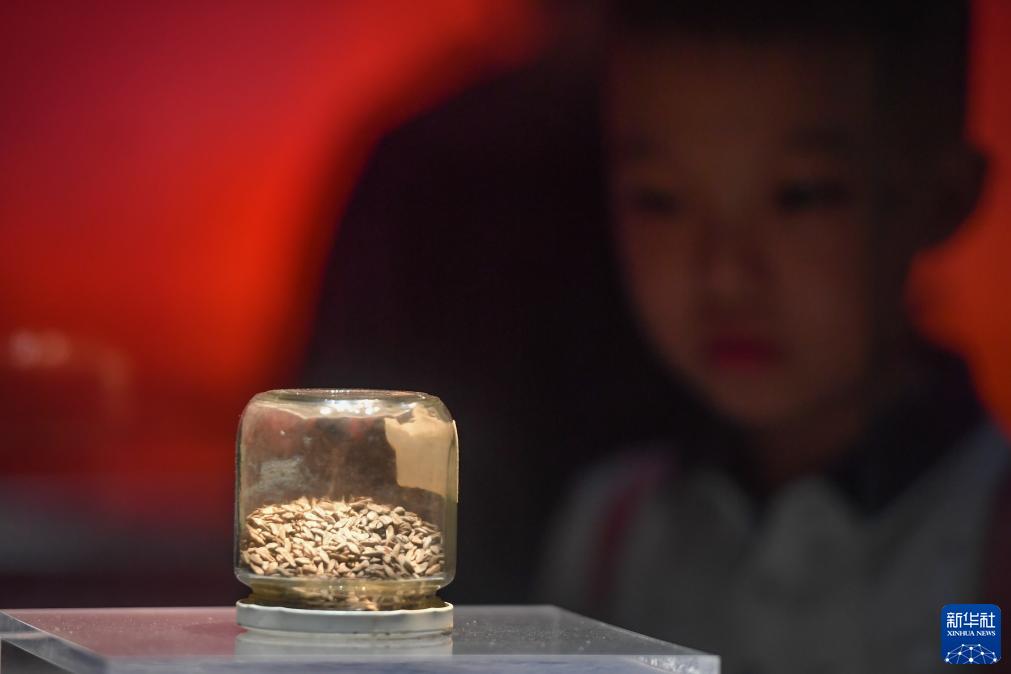 8月26日,在長沙市芙蓉區的隆平水稻博物館,小朋友在參觀馬王堆1號漢墓出土的稻谷。