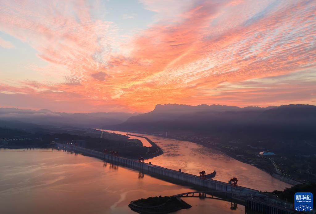 近日,長江三峽上空出現絢麗朝霞,與三峽樞紐工程構成一幅美麗的生態畫卷。