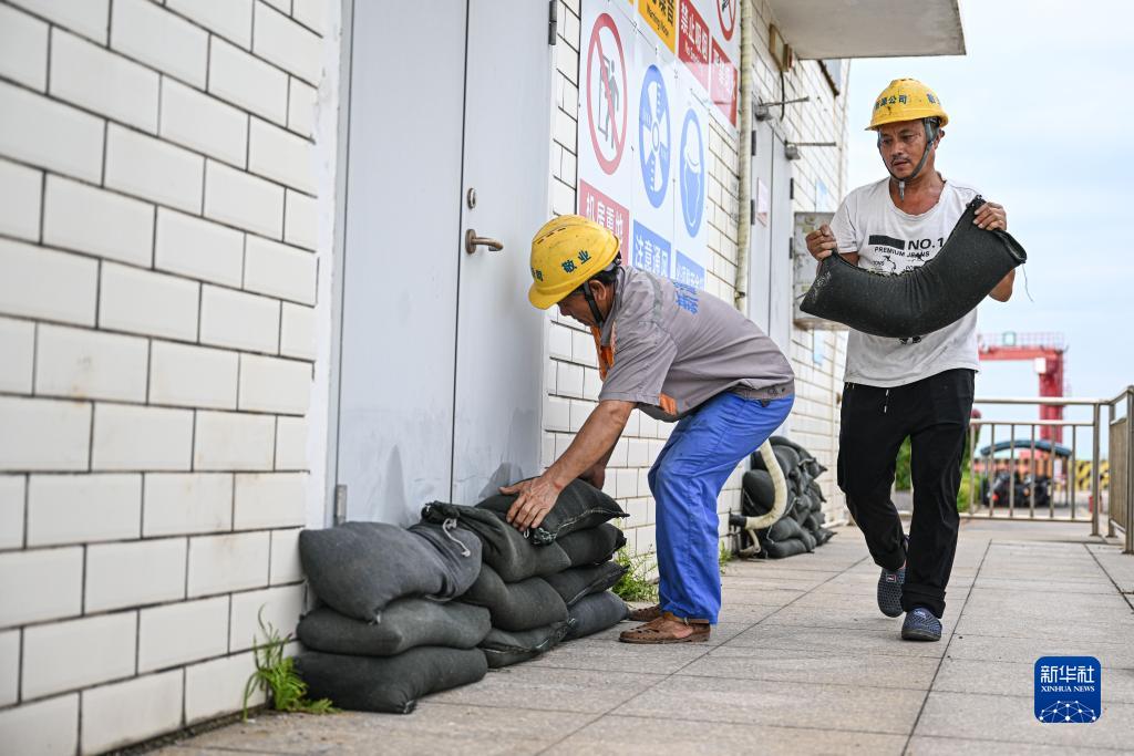 9月2日,工人在海南省??谑行潞8垡惶帣C房門外放置防汛沙袋。